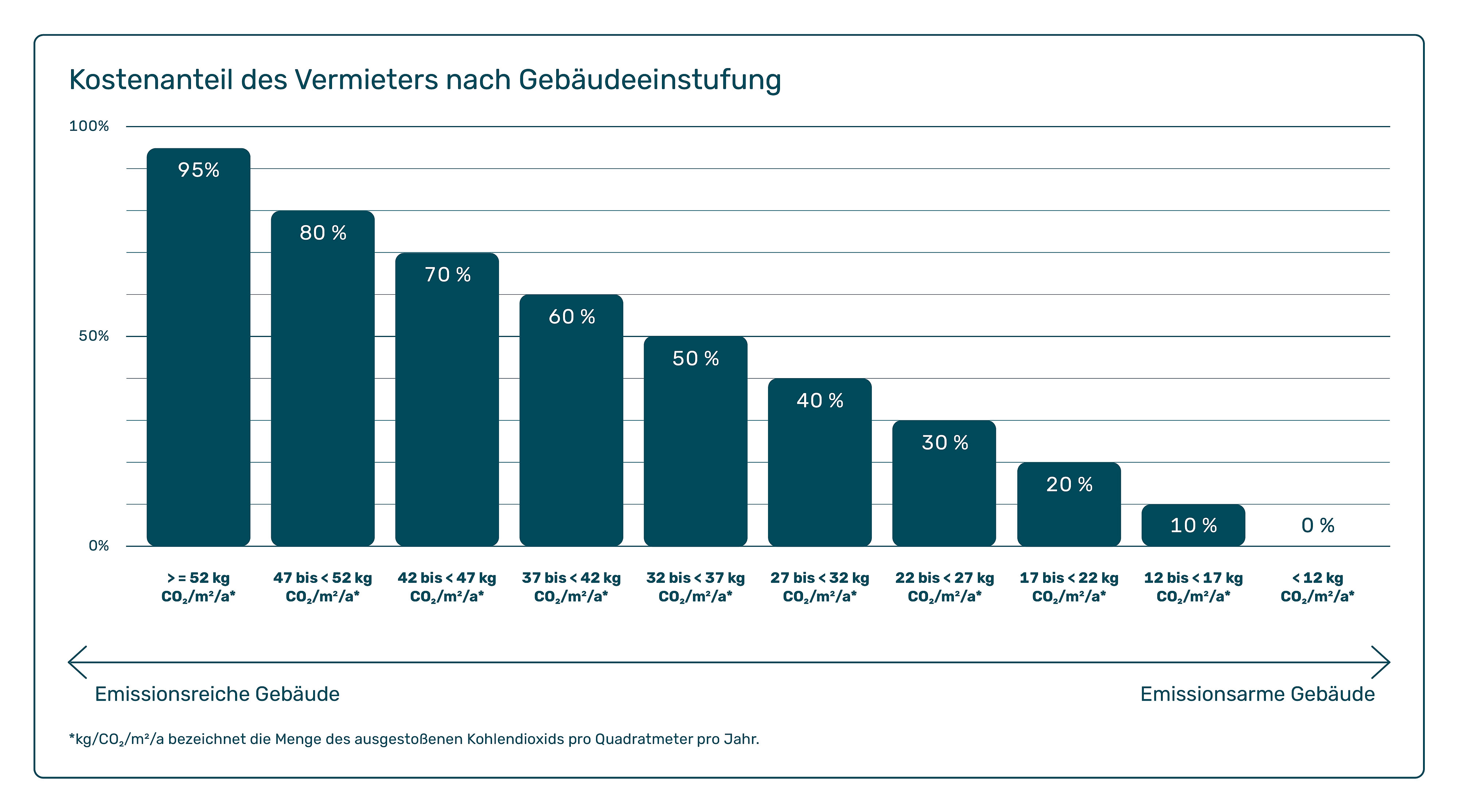 Für Wohngebäudeeigentümer:innen und Vermietende ist beim CO₂-Kostenaufteilungsgesetz vor allem eines wichtig: Je höher der Kohlendioxidausstoß des Gebäudes ist, desto stärker fällt der Kostenanteil für Vermietende aus. Weist das Gebäude dagegen eine gute Energiebilanz auf, etwa aufgrund einer Wärmedämmung oder anderer Effizienzmaßnahmen wie der Einsatz smarter Heizkörperthermostate, verringert sich entsprechend der Kostenanteil der Eigentümer:innen bzw. Vermietenden.
